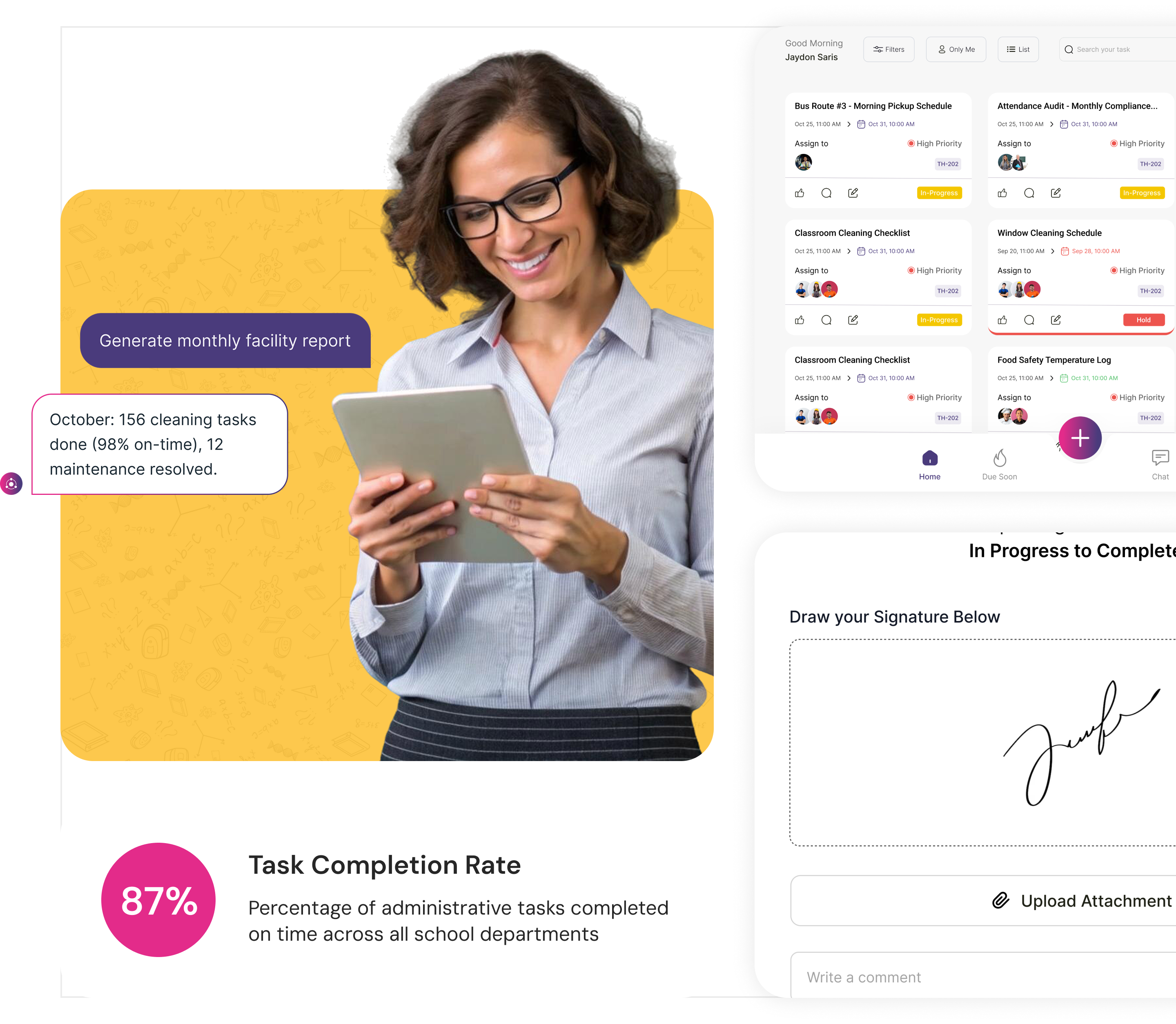 Distribute assignments across departments with clear deadlines. Staff receive notifications and update progress real-time from mobile devices.